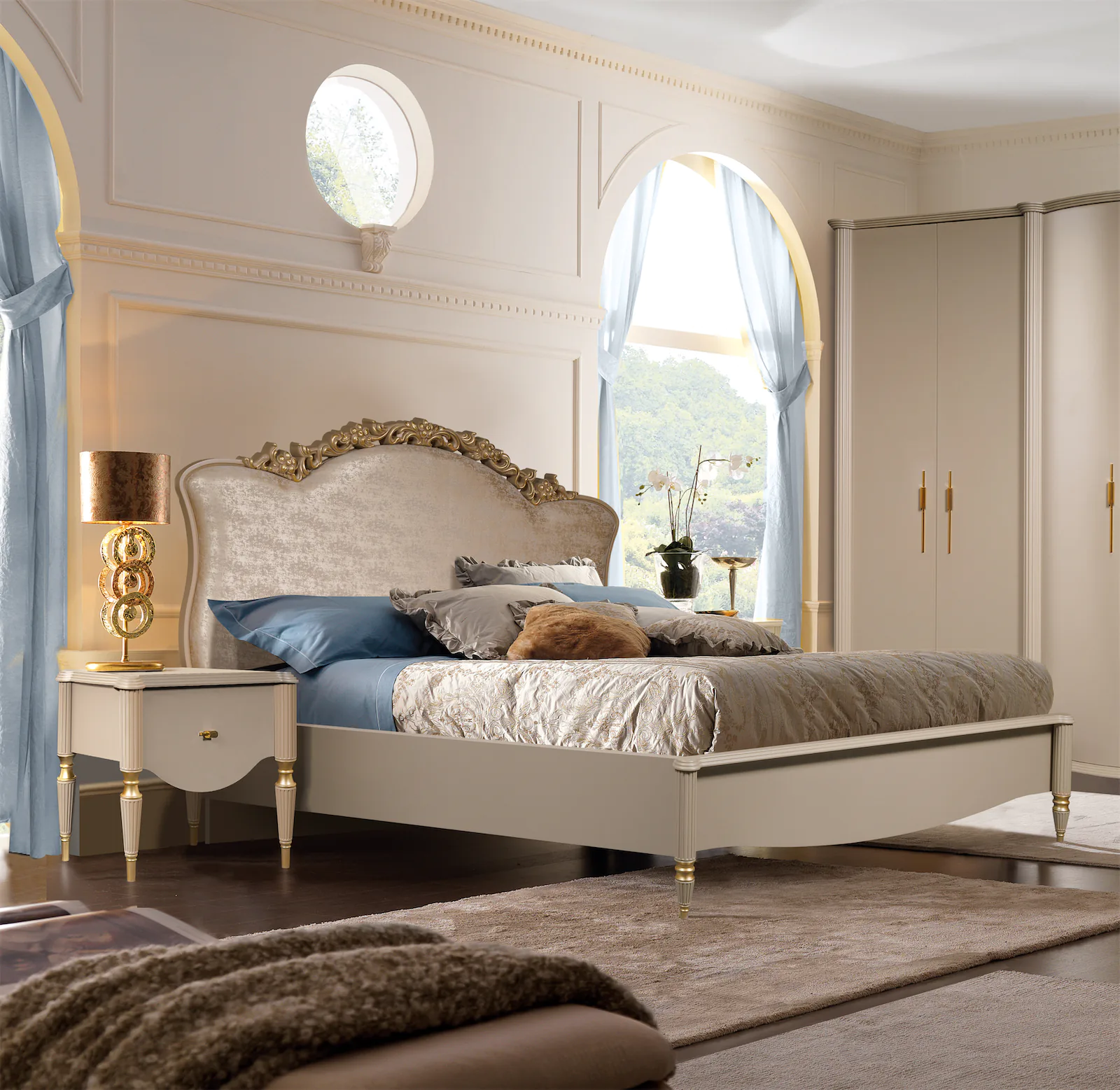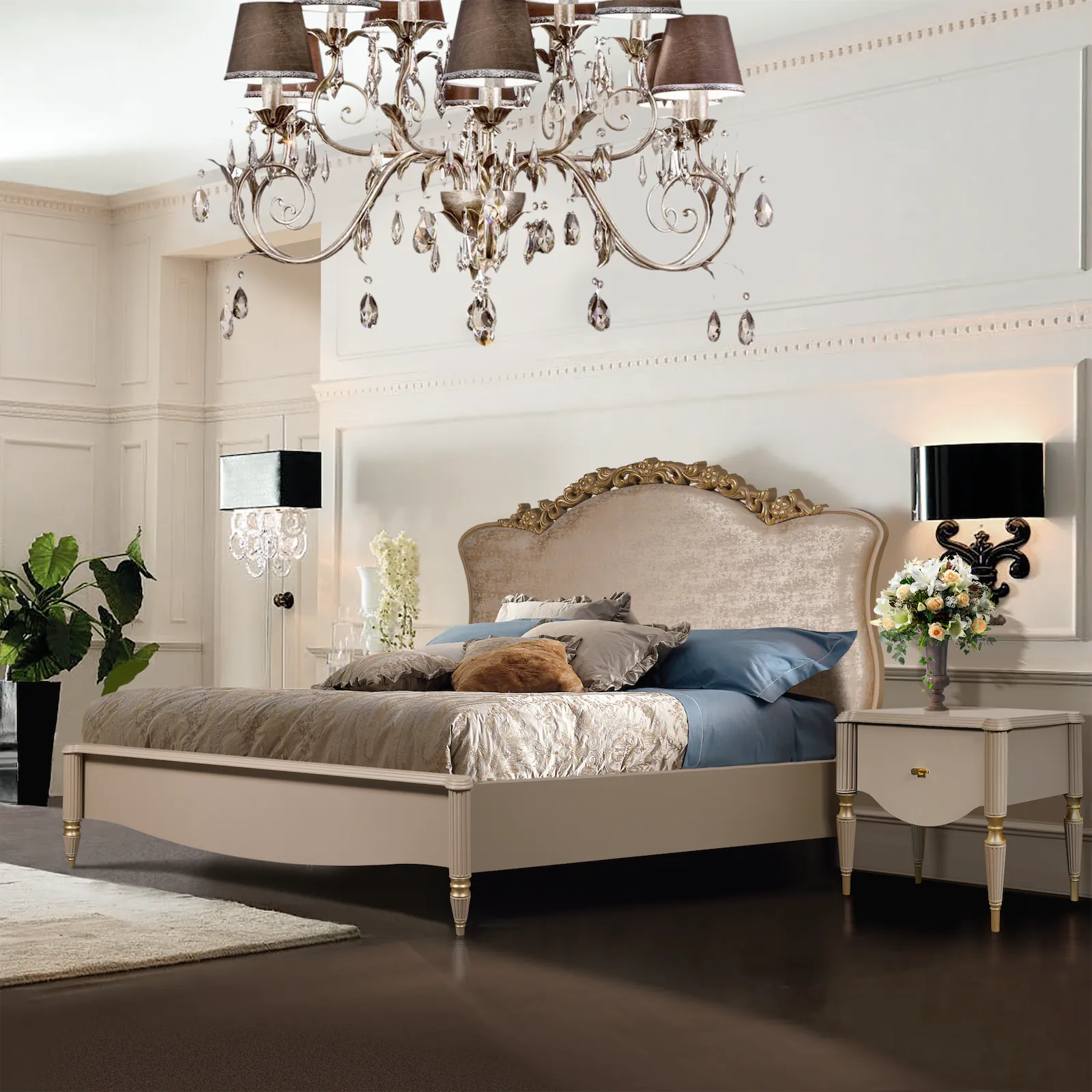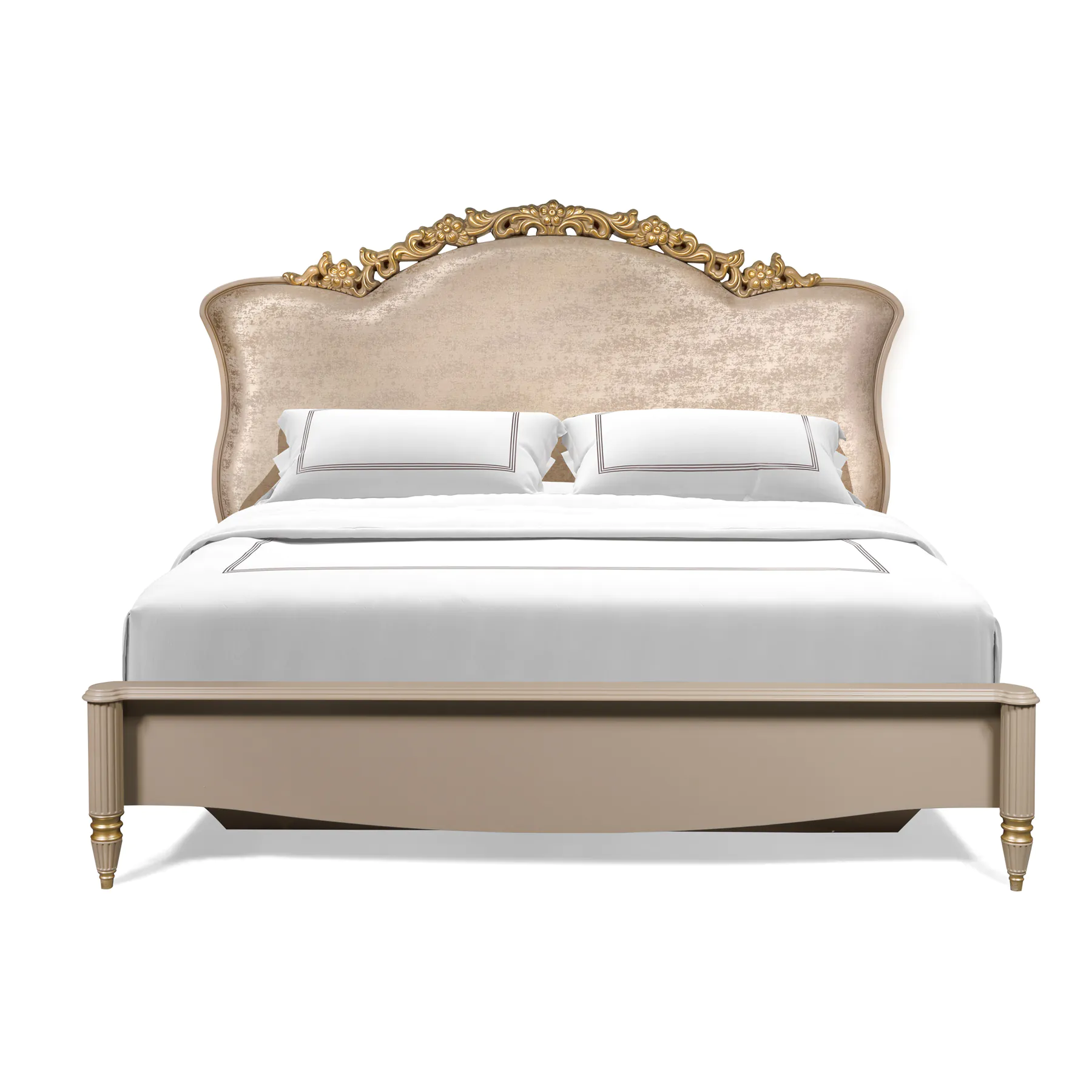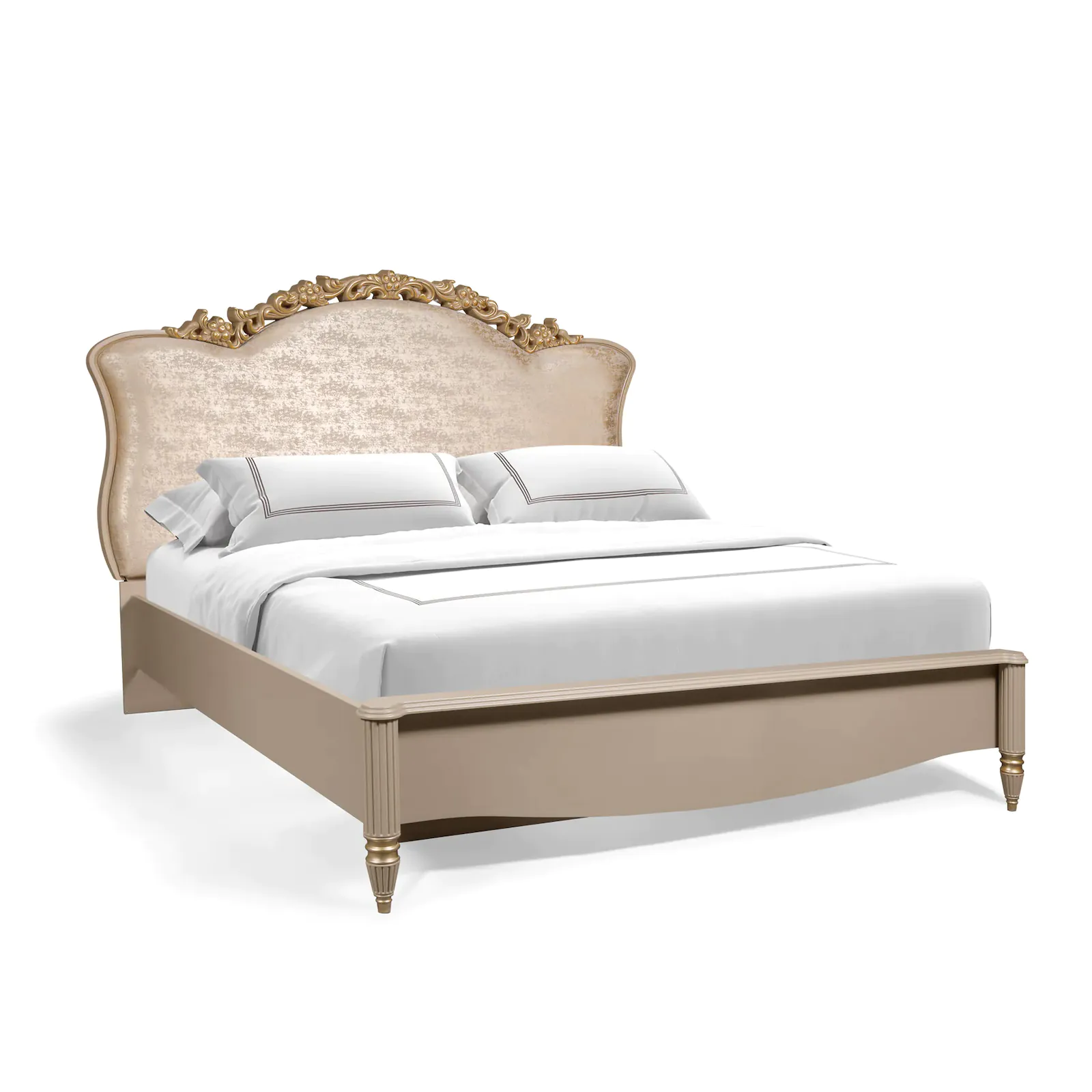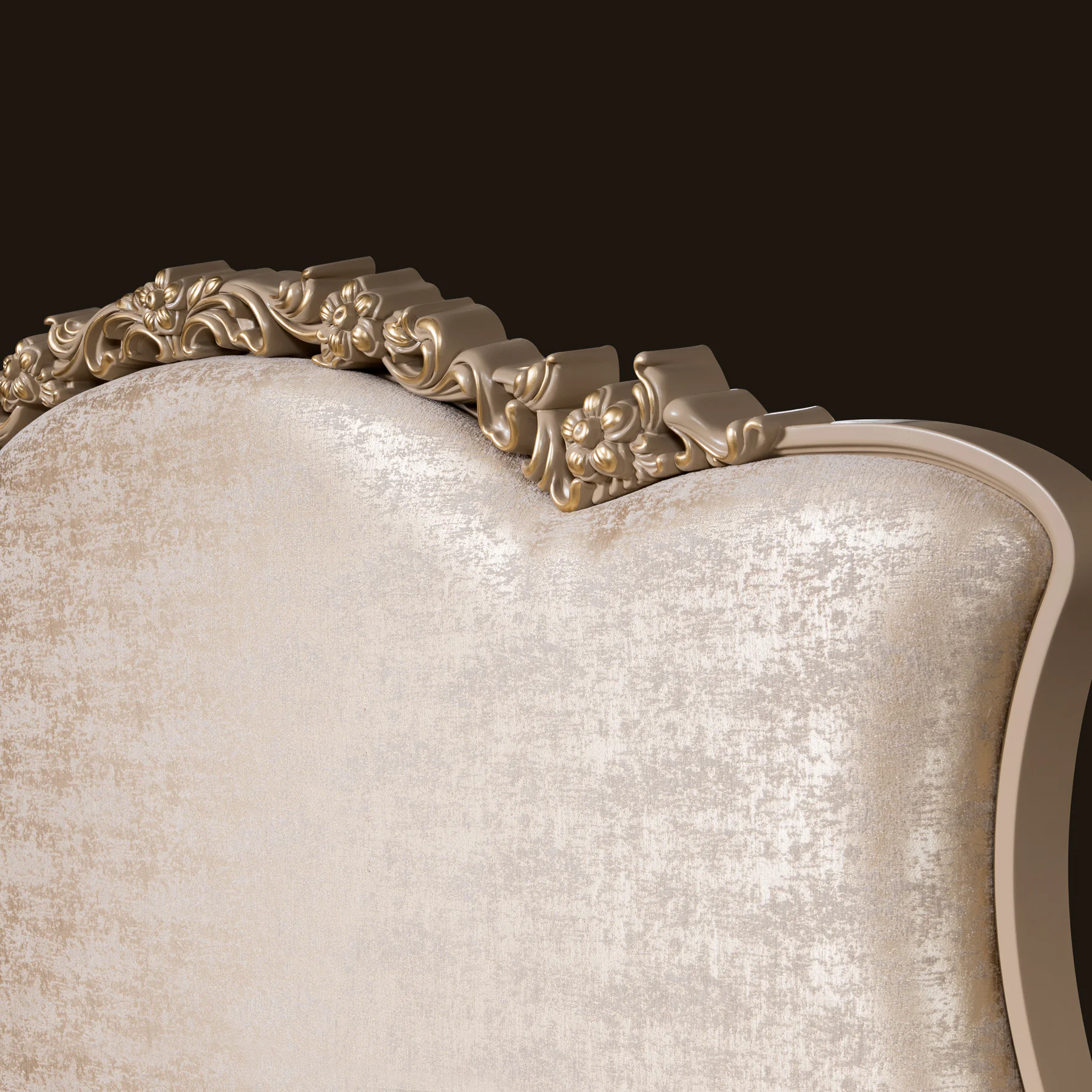 Изголовье кровати обито тканью премиум-класса и украшено золотым резным узором, что придает ей изысканный вид и создает атмосферу роскоши. Нежный капучиновый оттенок добавляет тепла и гармонии в пространство, делая спальню более уютной.